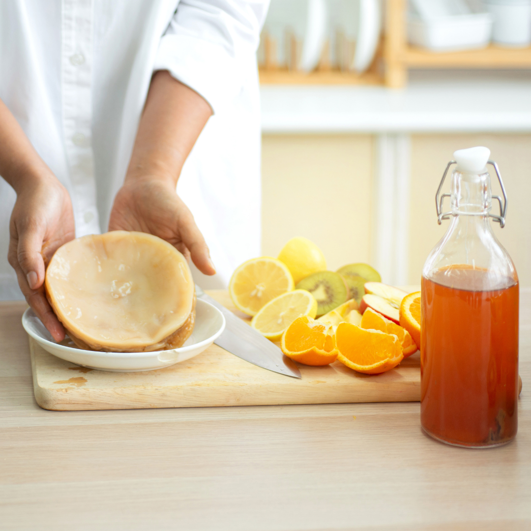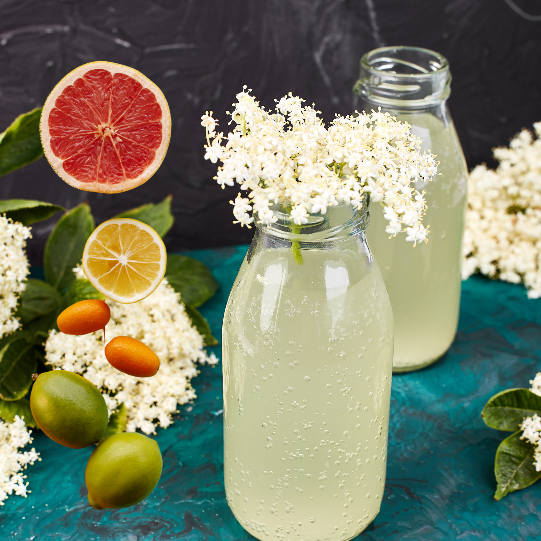 Защо тази рецепта: Медените нотки на бъза и слънчевият портокал създават пролетен блясък в комбучата.